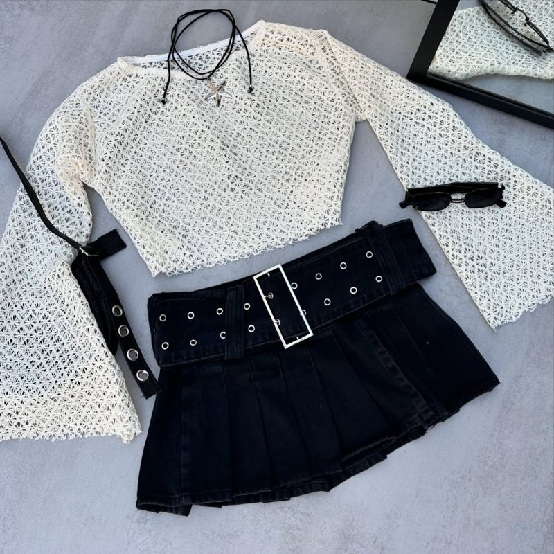A saia tem corte plissado com caimento estruturado e vem com cinto grosso fixo, cheio de ilhós, que já dá o toque estiloso no visual. O tecido é jeans preto encorpado, firme no corpo e confortável ao mesmo tempo.