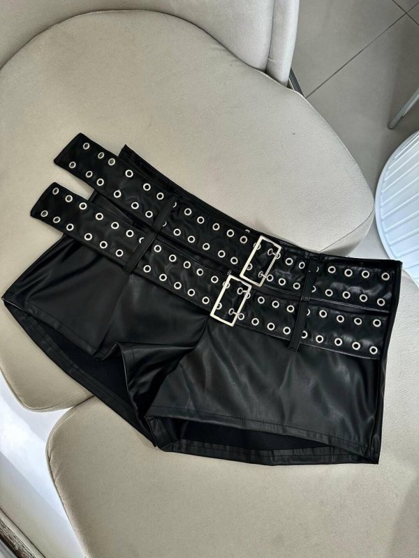Peça chave que rouba a cena. O couro sintético dá o brilho, o cinto duplo com ilhós entra como assinatura. Estrutura firme, caimento justo.