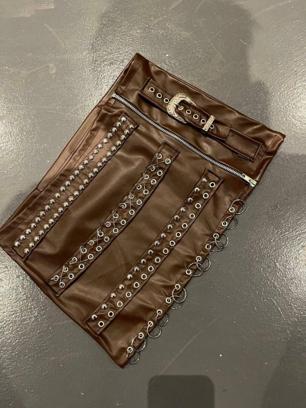 Essa saia grita rebeldia com detalhe, cheia de personalidade. Ela mistura elementos de estética punk com acabamento refinado: zíper aparente, cinto western, tiras com ilhós, argolas e spikes